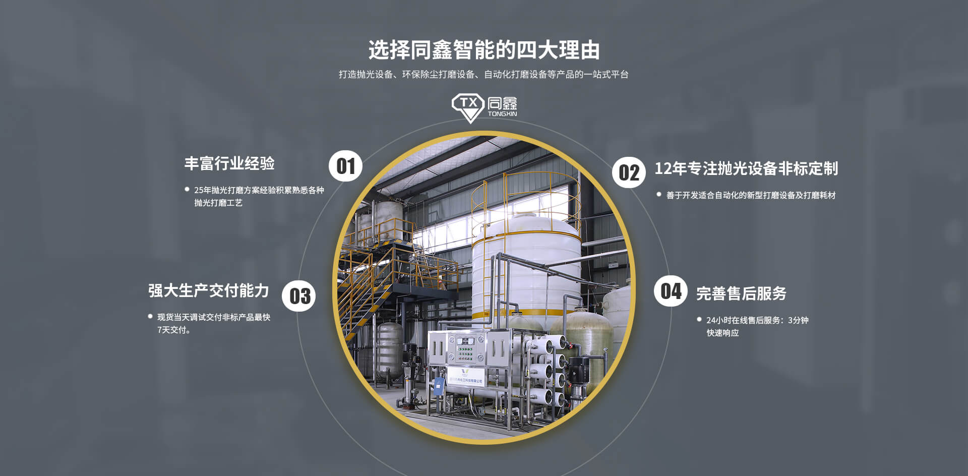 佛山市同鑫智能裝備科技有限公司位于廣東省大灣區(qū)腹地——佛山,成立于2009年4月,多年來(lái)一直致力于主要拋光打磨設(shè)備的研發(fā)生產(chǎn)和銷售。集焊接、打磨、噴涂、粉塵空氣凈化、智能廢水回收的技術(shù)研發(fā)、制造、銷售于一體的專業(yè)非標(biāo)自動(dòng)化設(shè)備的企業(yè),公司擁有一大批應(yīng)用高級(jí)工程師及技工人才,公司在技術(shù)上不斷創(chuàng)新、研討、不斷引進(jìn)先進(jìn)設(shè)備,技術(shù)日新月異,受到客戶一致好評(píng)。